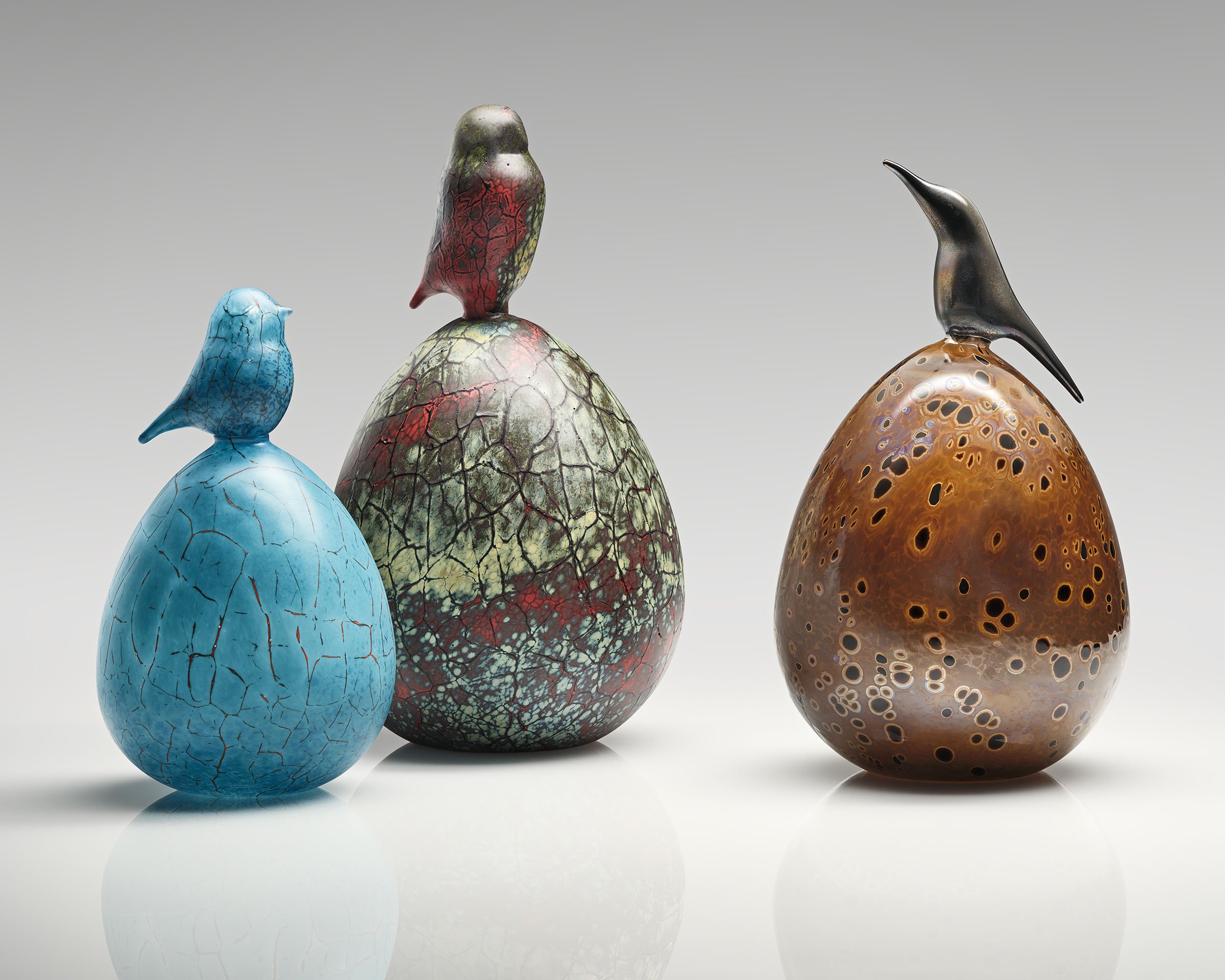 A brooding bird period typically begins when the first egg is laid and lasts until the chicks are fledged. My Brooding Bird series exaggerates this natural cycle of life by juxtaposing a small but determined bird on a huge egg of responsibility. Life is fragile, eggs are fragile, and I find that glass is the perfect material for this series.